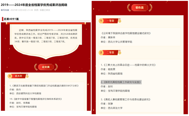 12月30日,陕西省档案学会2019—2024年度档案学优秀成果奖公布,图书(档案)馆赵钊博士的专著《新时代高校档案工作研究与实践》和论文《数字中国背景下智慧档案馆评价指标体系研究》分别荣获著作类二等奖和论文类优秀奖。
